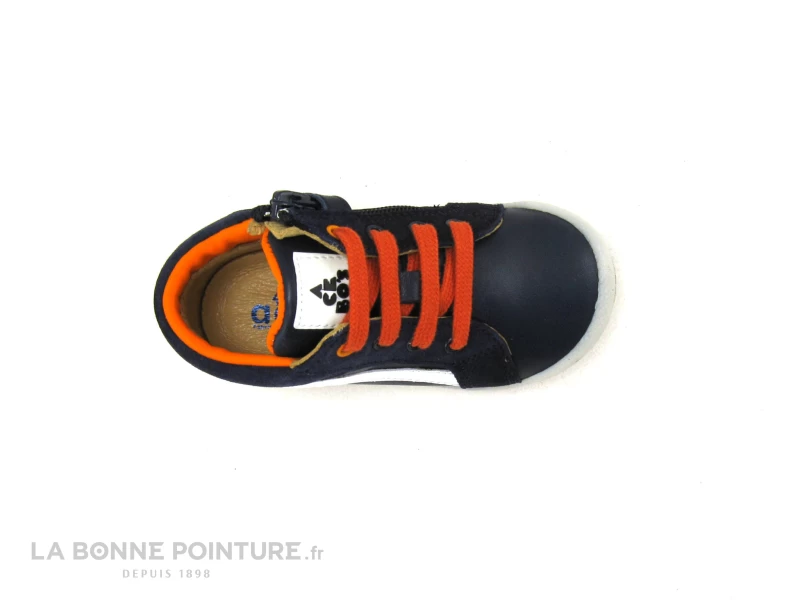 Cette chaussure bébé est en cuir de qualité bleu marine, avec une partie façon damier orange et bleue à l’arrière.