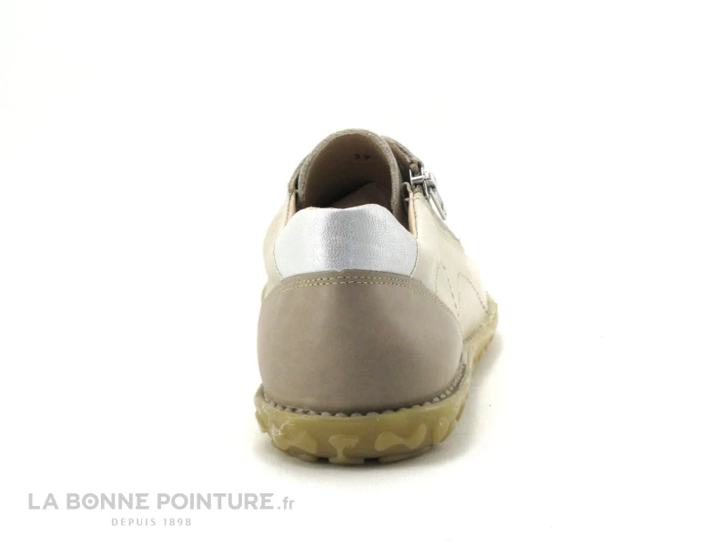 Cette chaussure plate Femme avec zip est en cuir beige, avec l’arrière bicolore marron clair et argent.