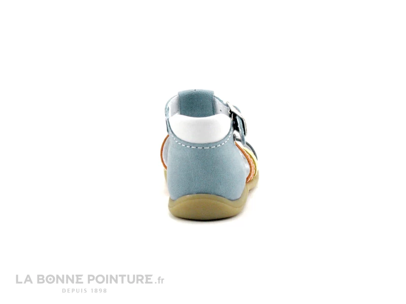 Cette chaussure bĂ©bĂ© garçon est en cuir bleu clair, avec des brides sur l’avant aux tons de gris, jaune et orange.