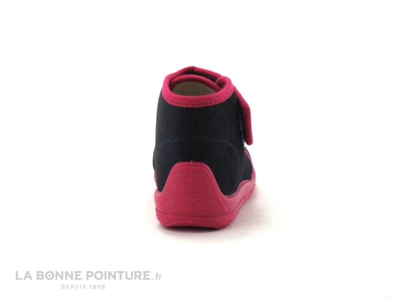 Cette pantoufle bébé fille Bellamy Vana est en velours bleu marine, avec le pourtour fuchsia.