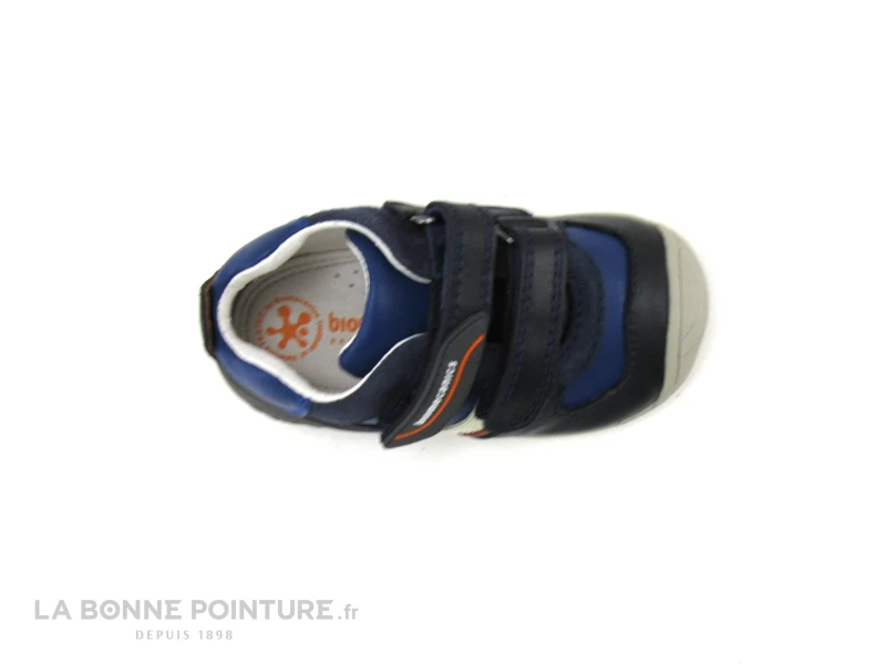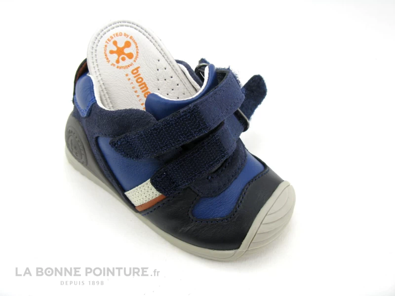 Ce bottillon bébé de grande qualité Biomecanics 211132A mélange cuir lisse et cuir velours, aux tons de bleu marine et de bleu électrique.