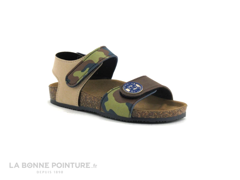 Ces sandales enfant sont en simili cuir marron, beige et imprimé camouflage kaki et bleu.