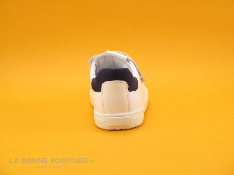 Votre petit garçon sera confortablement chaussé dans ce modèle tout en cuir blanc avec une touche de bleu marine sur le contrefort arrière.