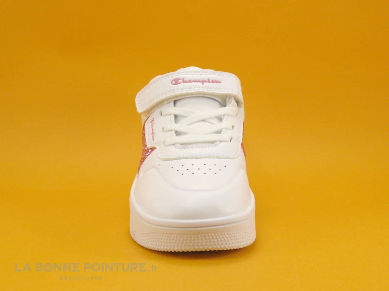 Cette basket fille à semelle épaisse Champion est en simili cuir blanc, avec de larges bandes rose pailleté de chaque côté.