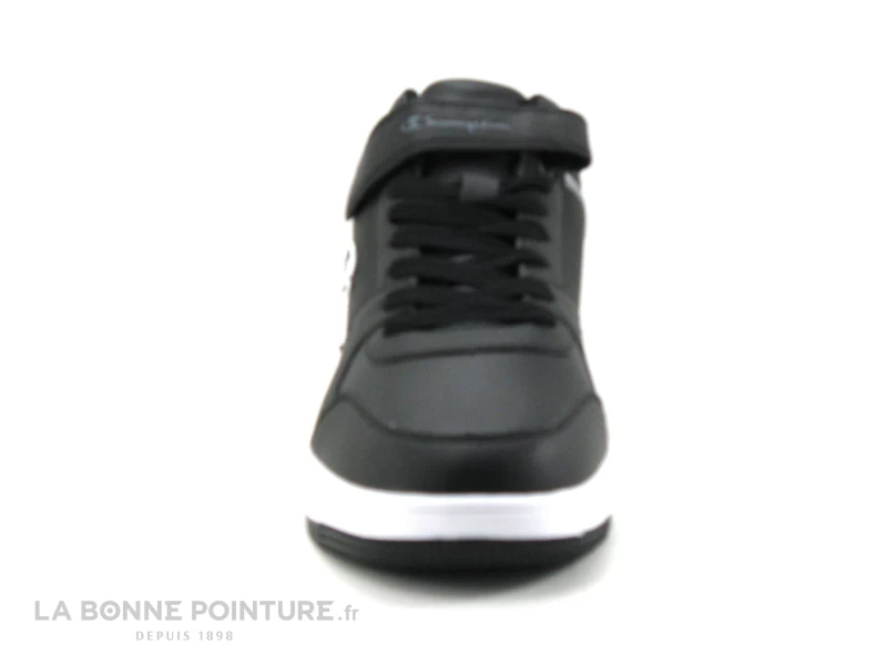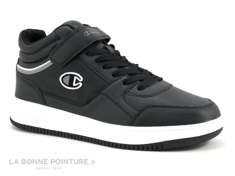 Ces belles sneakers montantes Homme Champion Rebound Vintage S21904 sont en simili cuir noir, avec un liseré gris et blanc sur les côtés.