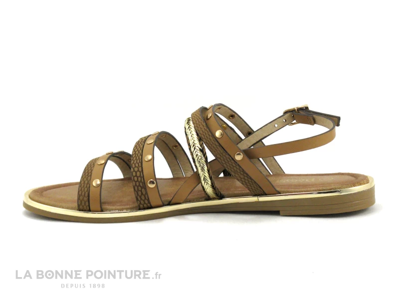 Sandales mode et pas chères Femme, les tongs camel et or Dees Shoes Moneda à petit prix !