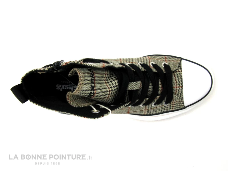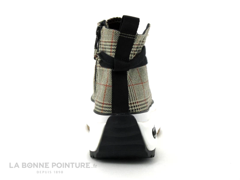 Cette basket montante Femme est en toile imprimée Prince de Galles, aux tons de marron, de noir et d’orange rouille sur fond beige.
