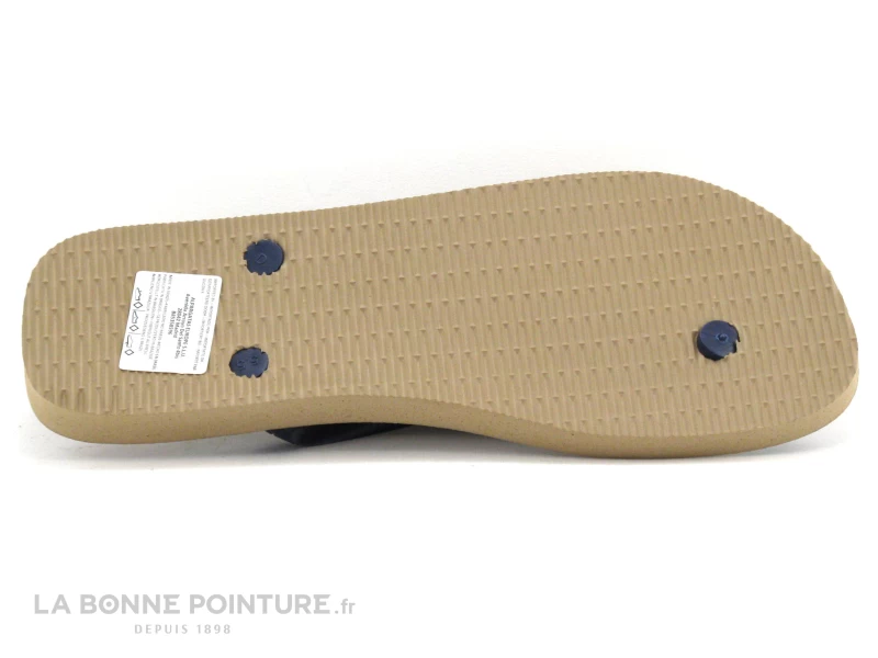 Cette tong est marron clair, couleur sable, avec les brides bleu marine et la marque Havaianas en blanc.