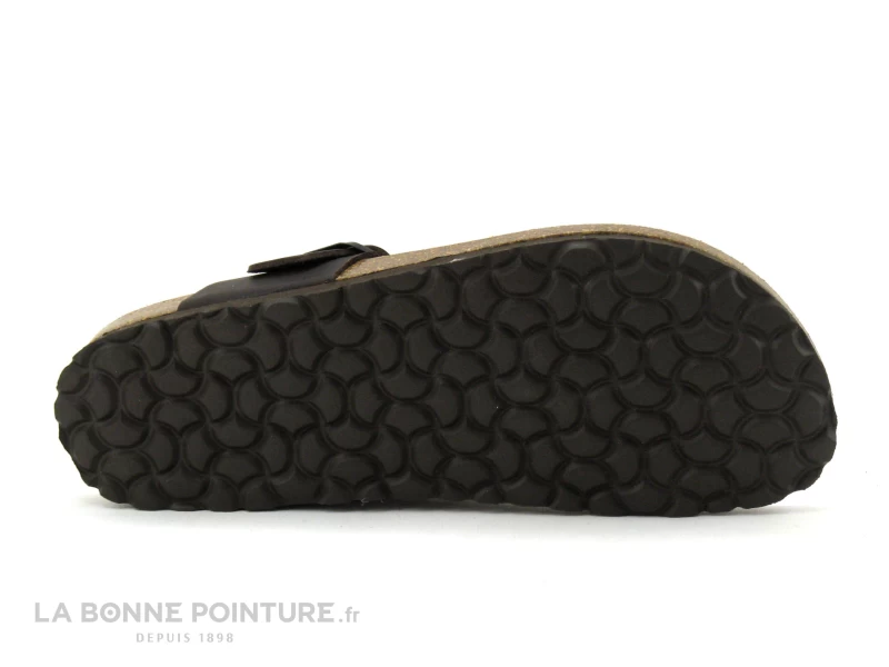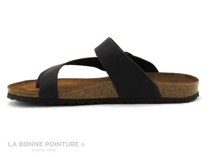 La tong homme Inter Bios bĂ©nĂ©ficie d’une large bride encuir veloutĂ© trĂšs souple marron foncĂ© qui enveloppe l’ orteil.