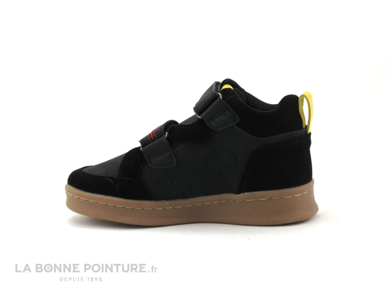 Cette chaussure montante enfant Kickers Bilbon est noire avec un peu de jaune et de rouge.
