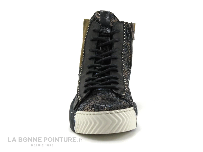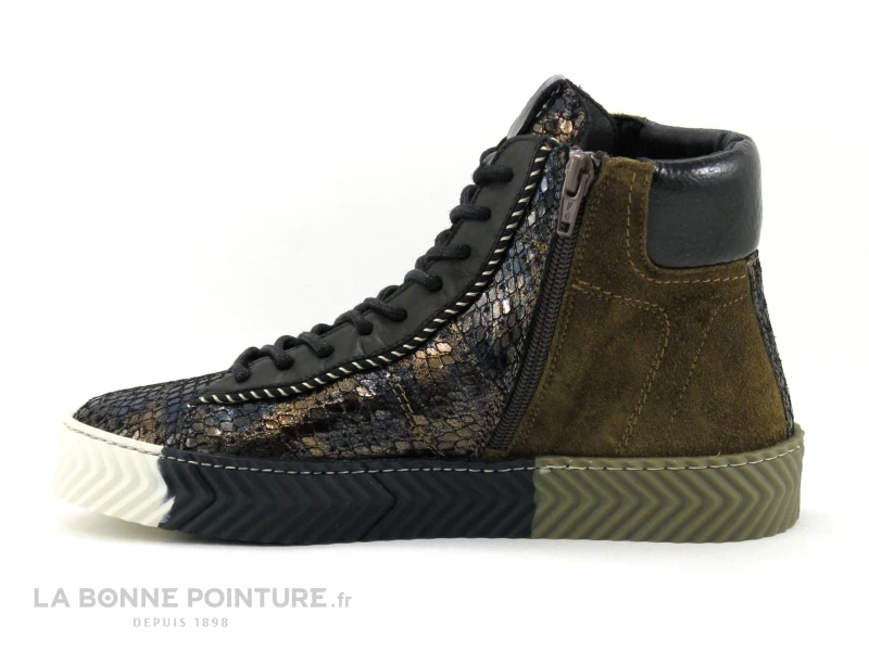 Ces superbes baskets montantes Femme La Vie est Belle Fusain mĂ©langent des parties de cuir bronze mĂ©tallisĂ© aspect cobra, marron velours et noir verni, pour un maximum d’allure !