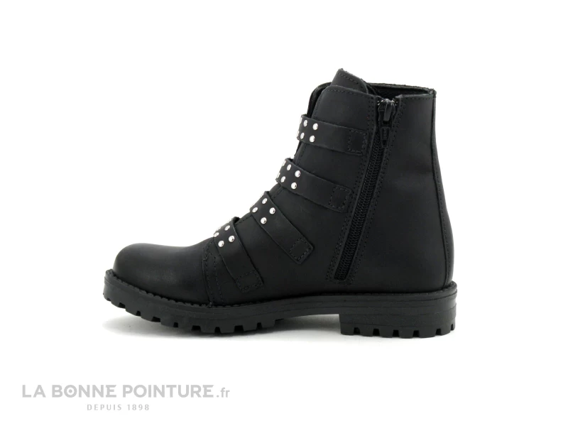 Cette bottine enfant est en cuir lisse noir, avec 4 brides à boucle ornées de petits clous argentés.