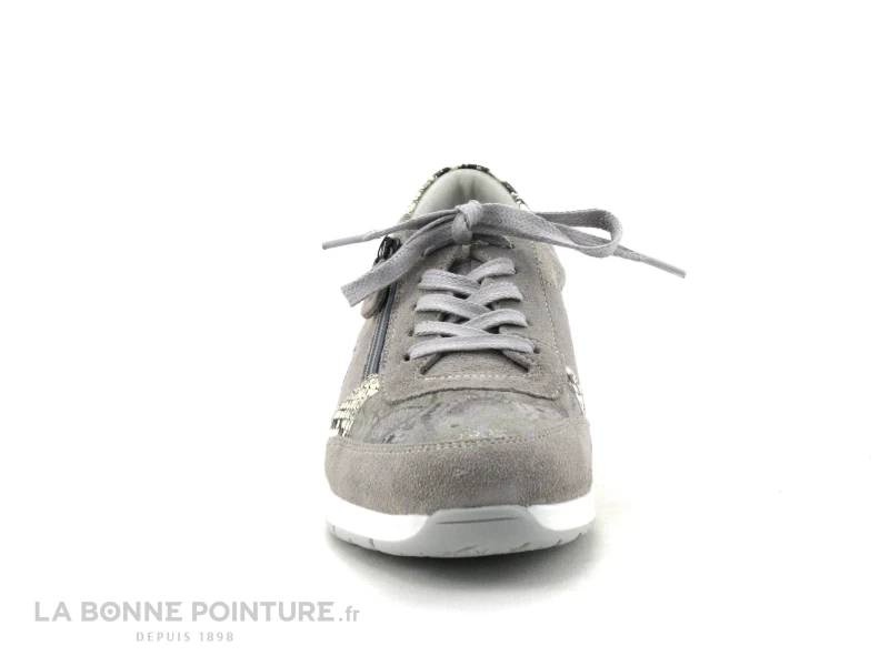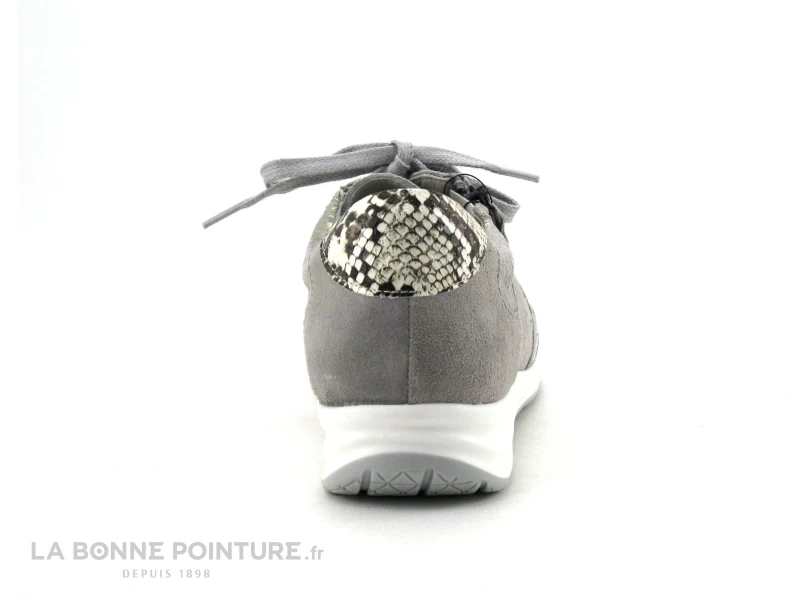 Cette basket confortable Femme Morans est en cuir velours beige, avec des parties aspect python et gris métallisé.