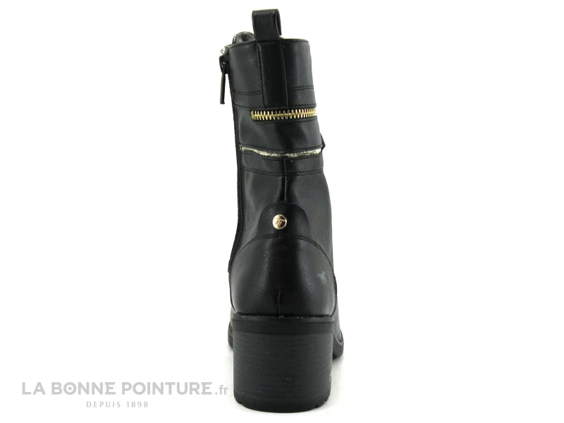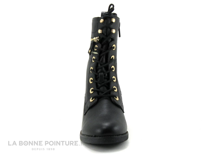 Cette ravissante bottine Mustang Femme est noire avec des petits détails Or qui donnent tout son charme au modèle : zip décoratif en haut des boots, liseré doré en-dessous, oeillets et crochets métalliques, sans oublier les petits clous sur la semelle…