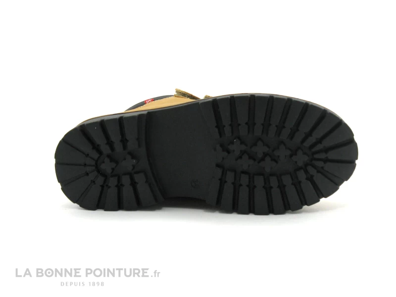 Cette chaussure montante enfant est en simili cuir camel / jaune gold, avec l’encolure noire et matelassée.