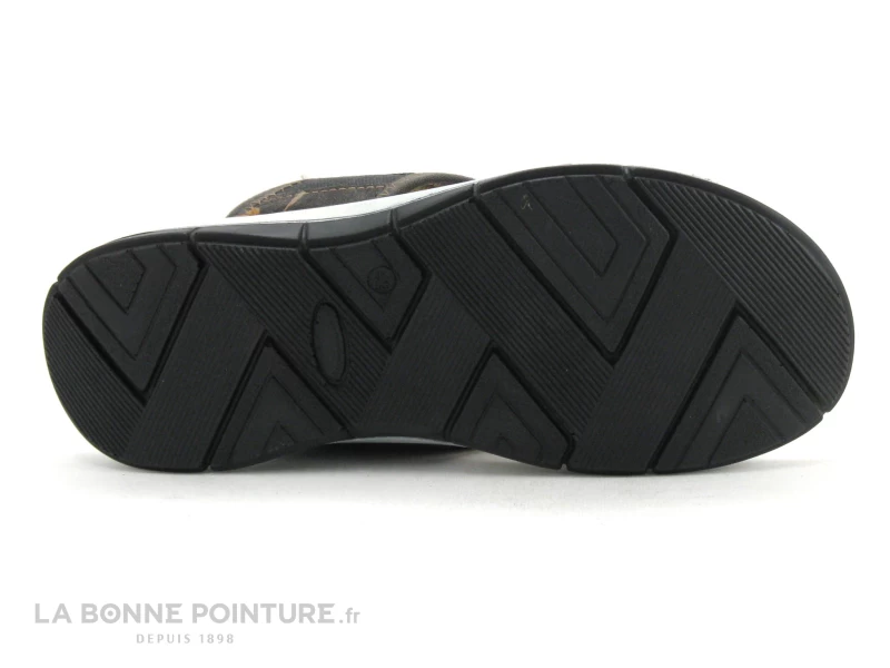 Cette mule est composĂ©e de 2 brides croisĂ©es, l’une en daim marron et l’autre en toile noir grisĂ©.