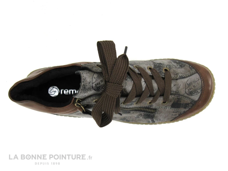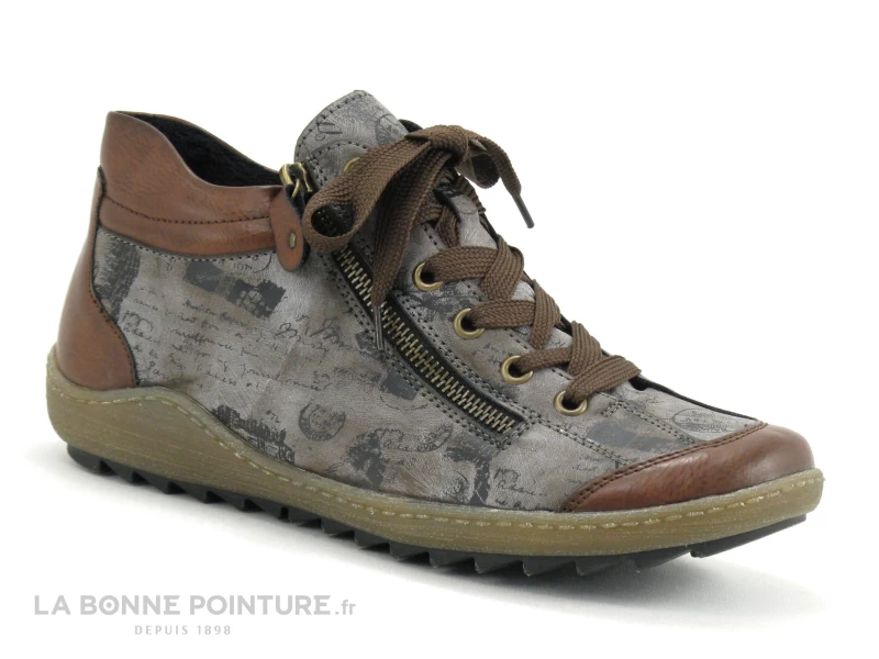 Voici de belles chaussures montantes Femme Remonte R1487-24 marron et gris imprimĂ©.Â