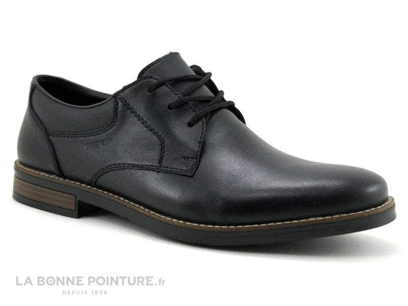 Ce derbi confortable Homme Rieker 13510-00 associe cuir lisse noir et simili cuir, avec des parties finement quadrillées sur les cÎtés.