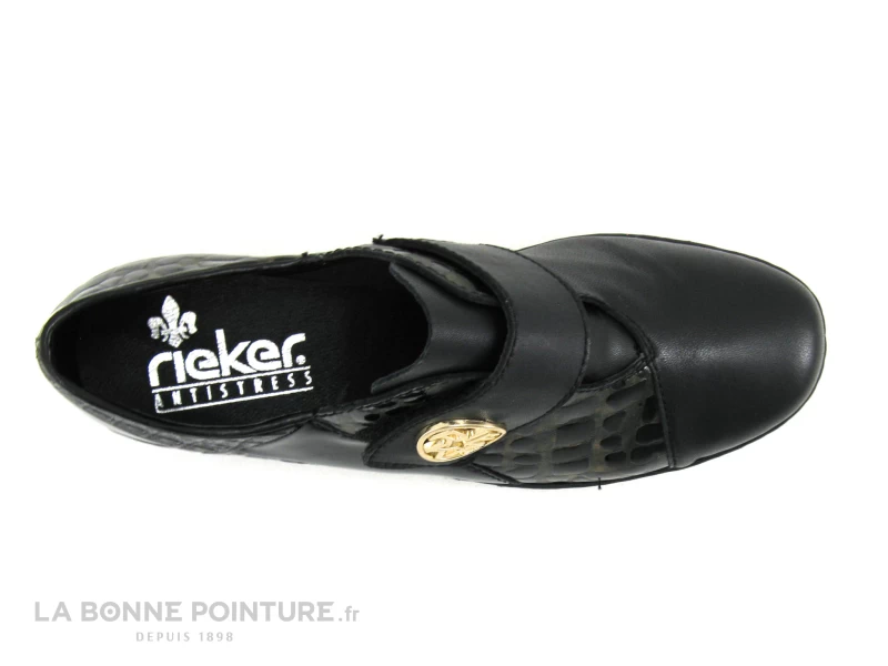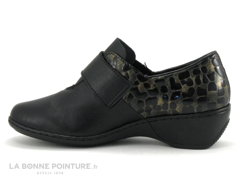 Cette chaussure basse Femme Rieker Antistress 47161-02 est noire, avec des parties lisses et vernies noires, aspect croco doré et reptile argent.