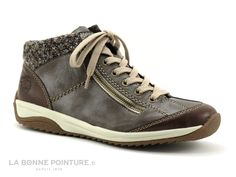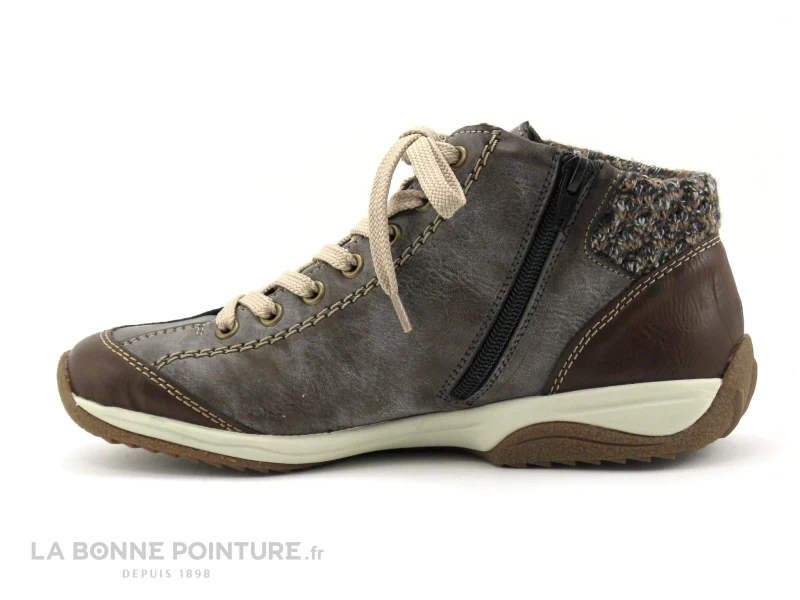 Voici de jolies baskets montantes Femme souples et originales Rieker L5223-24, aux tons de marron foncé et de marron grisé.