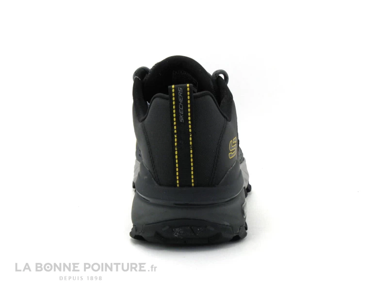 Cette chaussure de randonnée Homme Skechers est noire et grise, avec un peu de jaune.