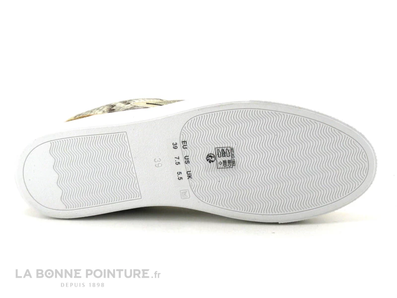 Cette basket ville Femme mélange des parties velours taupe (marron clair) et or, avec les côtés métallisés aspect reptile.