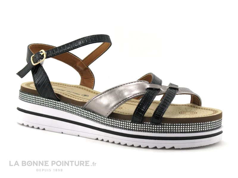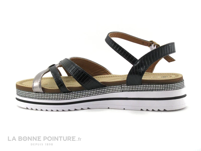 Votre pied sera confortablement maintenu par trois brides noires et argent sur l’avant et par un bracelet de cheville façon croco noir se fermant par une boucle.
