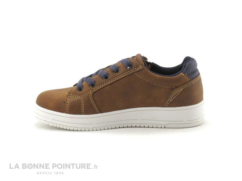 Cette paire de chaussures garçon à petit prix Wipop Ouriel est marron nuancé, avec un peu de bleu marine à l’arrière.