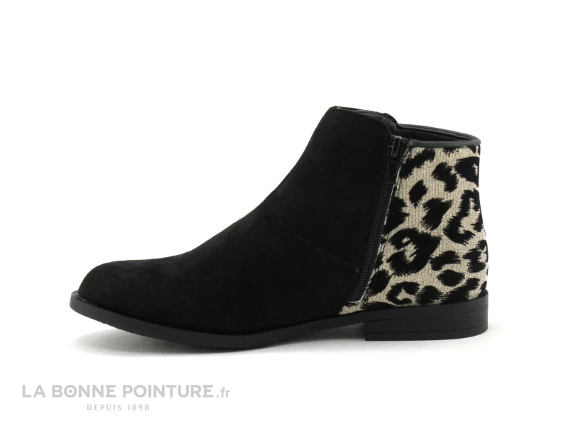 Ces boots fille sont en velours noir légèrement brillant, avec la partie arrière aspect léopard en noir et doré.